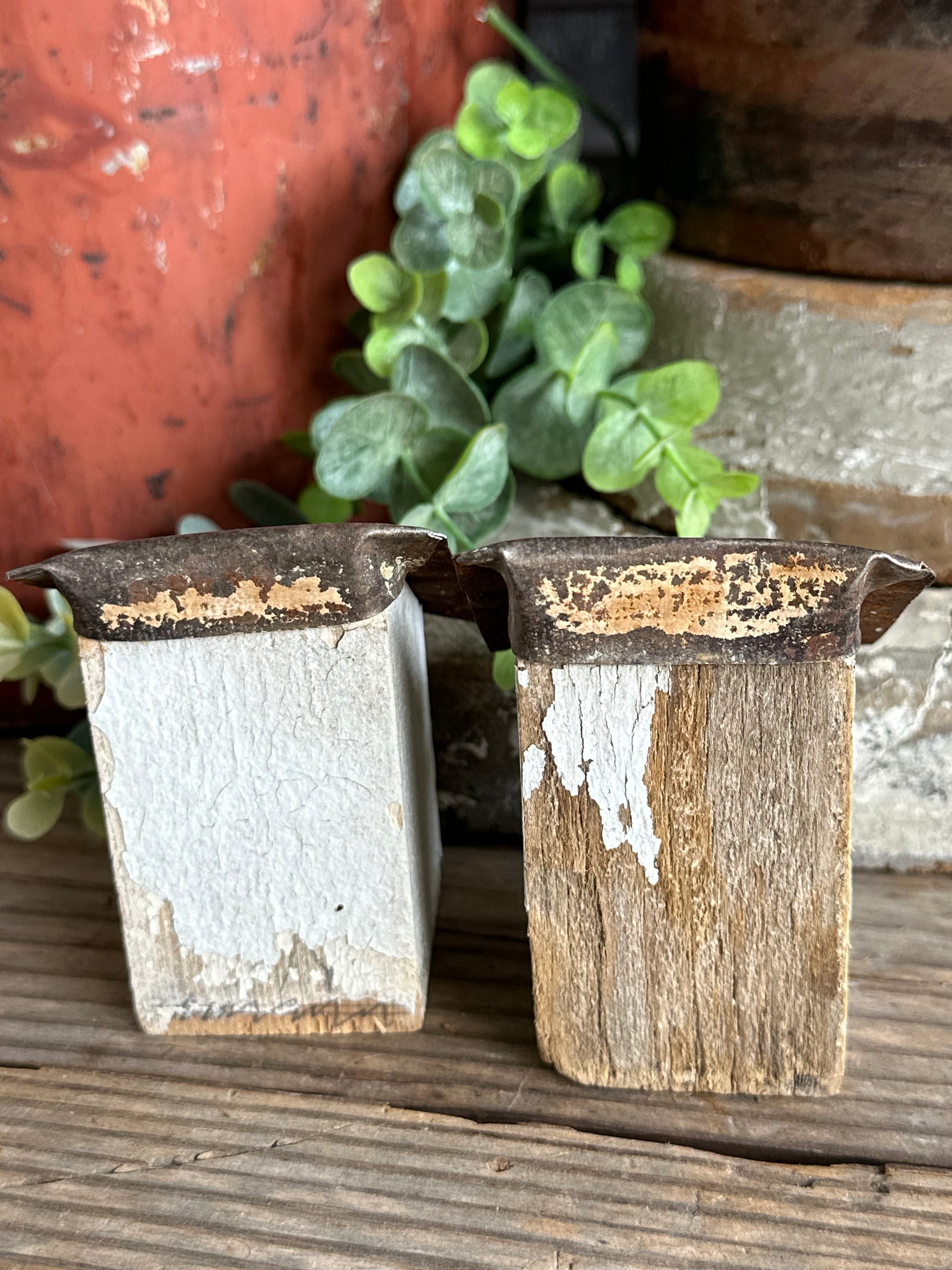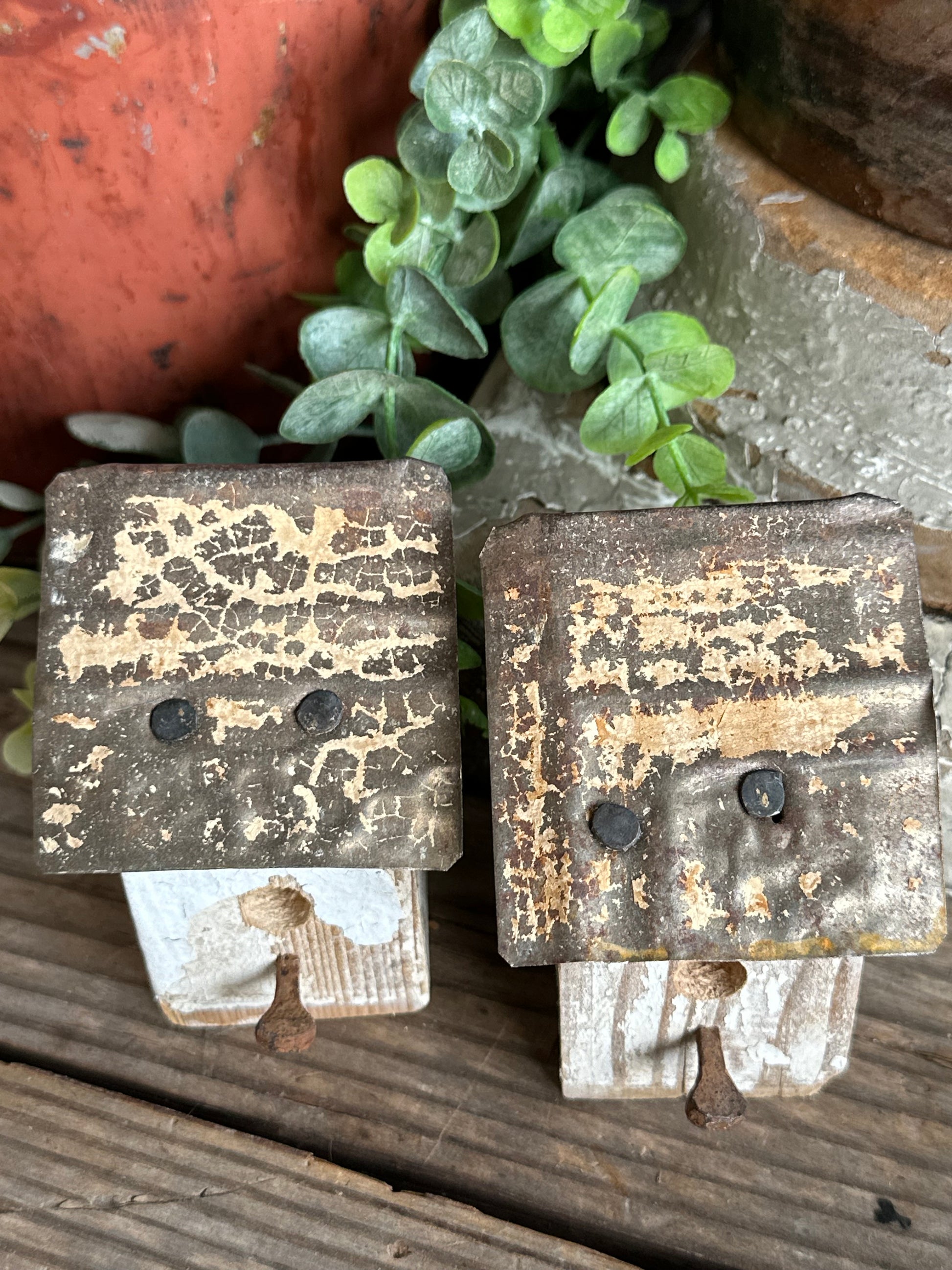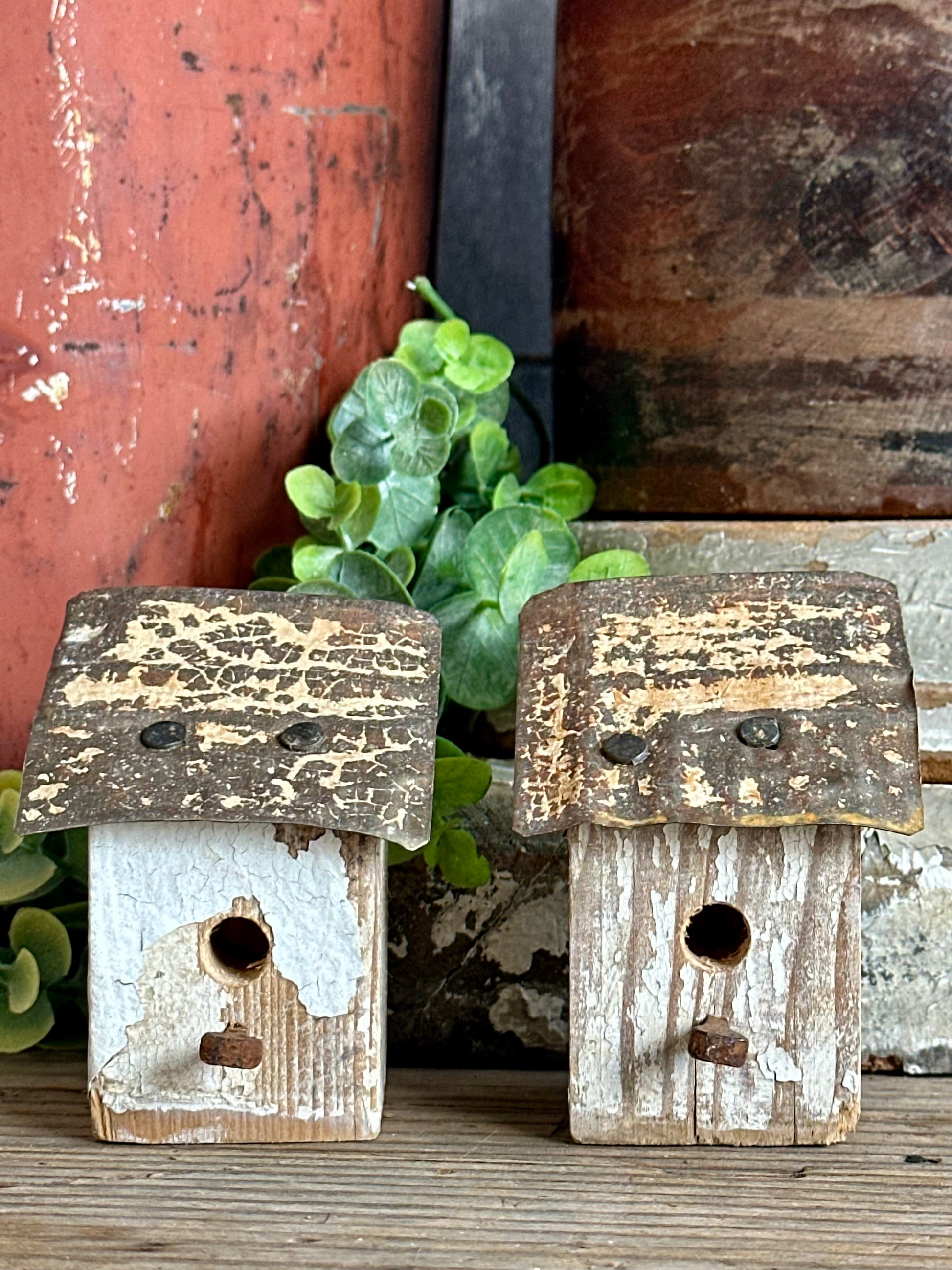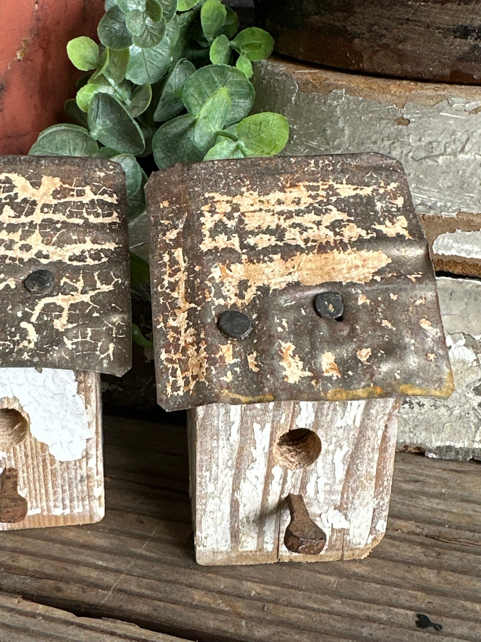 Set of two handmade "bitty" birdhouses. We make them from the end of architectural salvage wood spindles, add tin roof and hardware. Rusty metal nail and chippy paint tin roof. Chippy white weathered paint and rusty tin metal roof with tan/cream color paint. Decor only! Approx 3" & 3 1/8" tall, 1 5/8" x 1 5/8" bottom. Great to add to any decor!