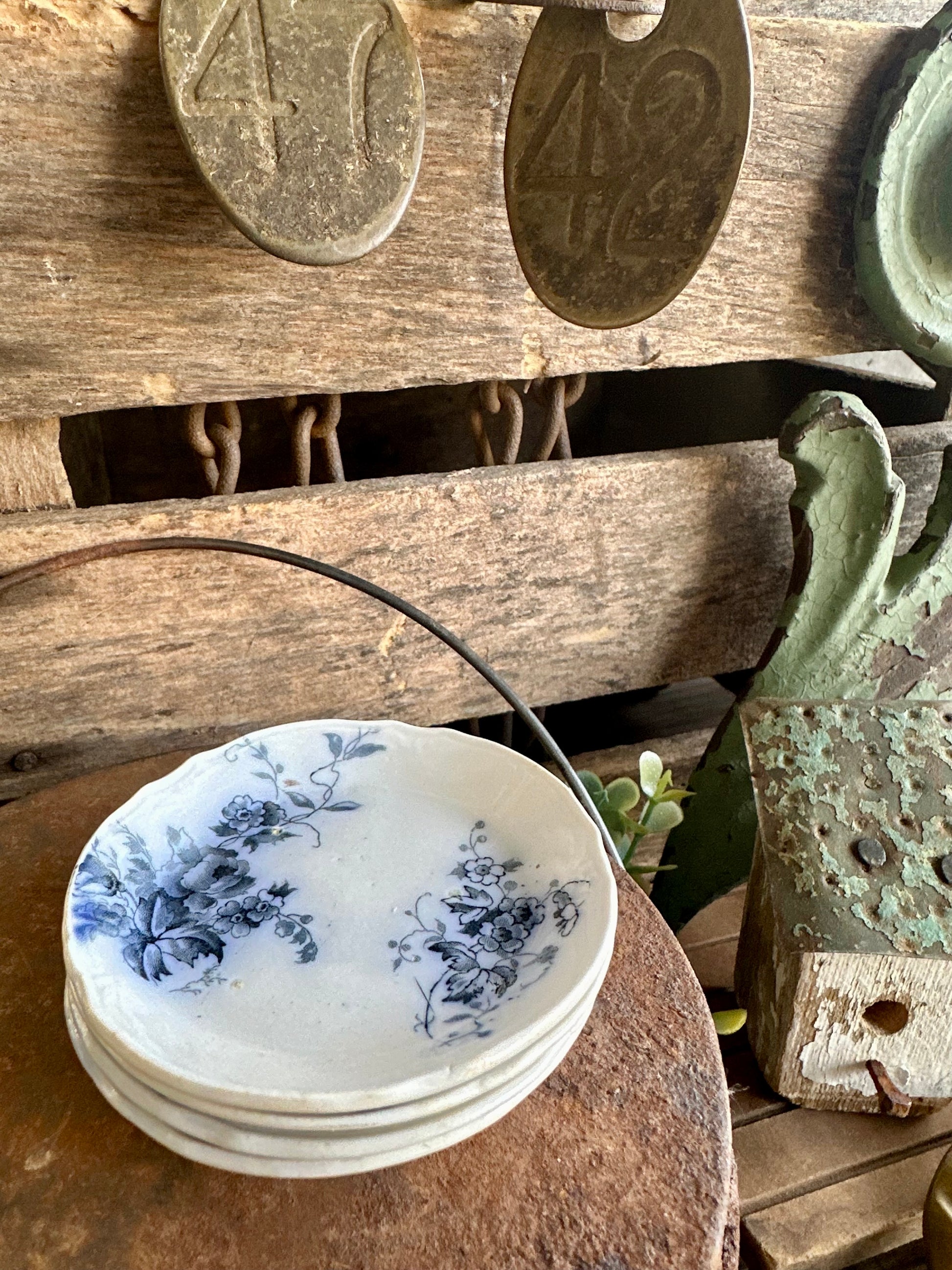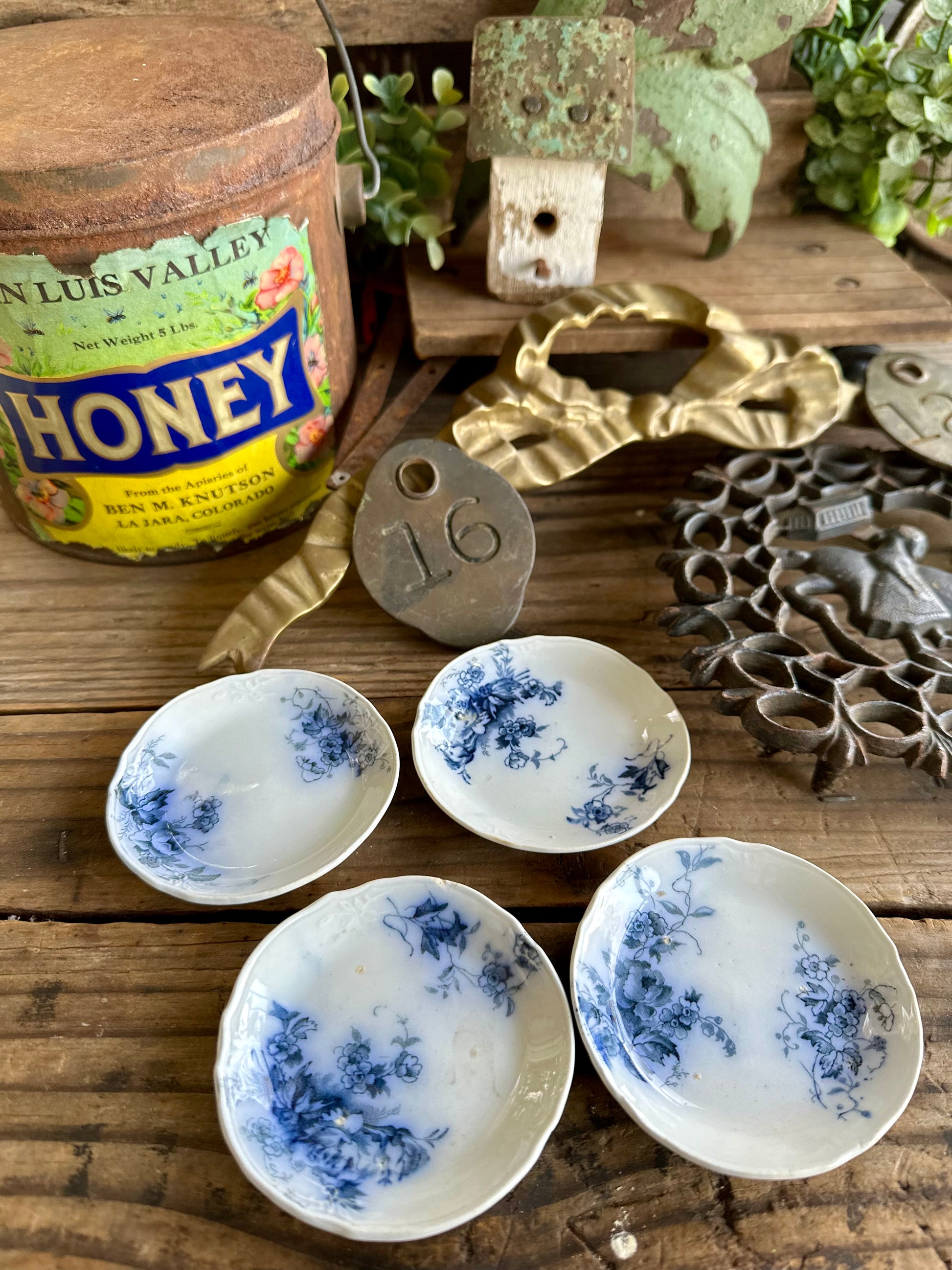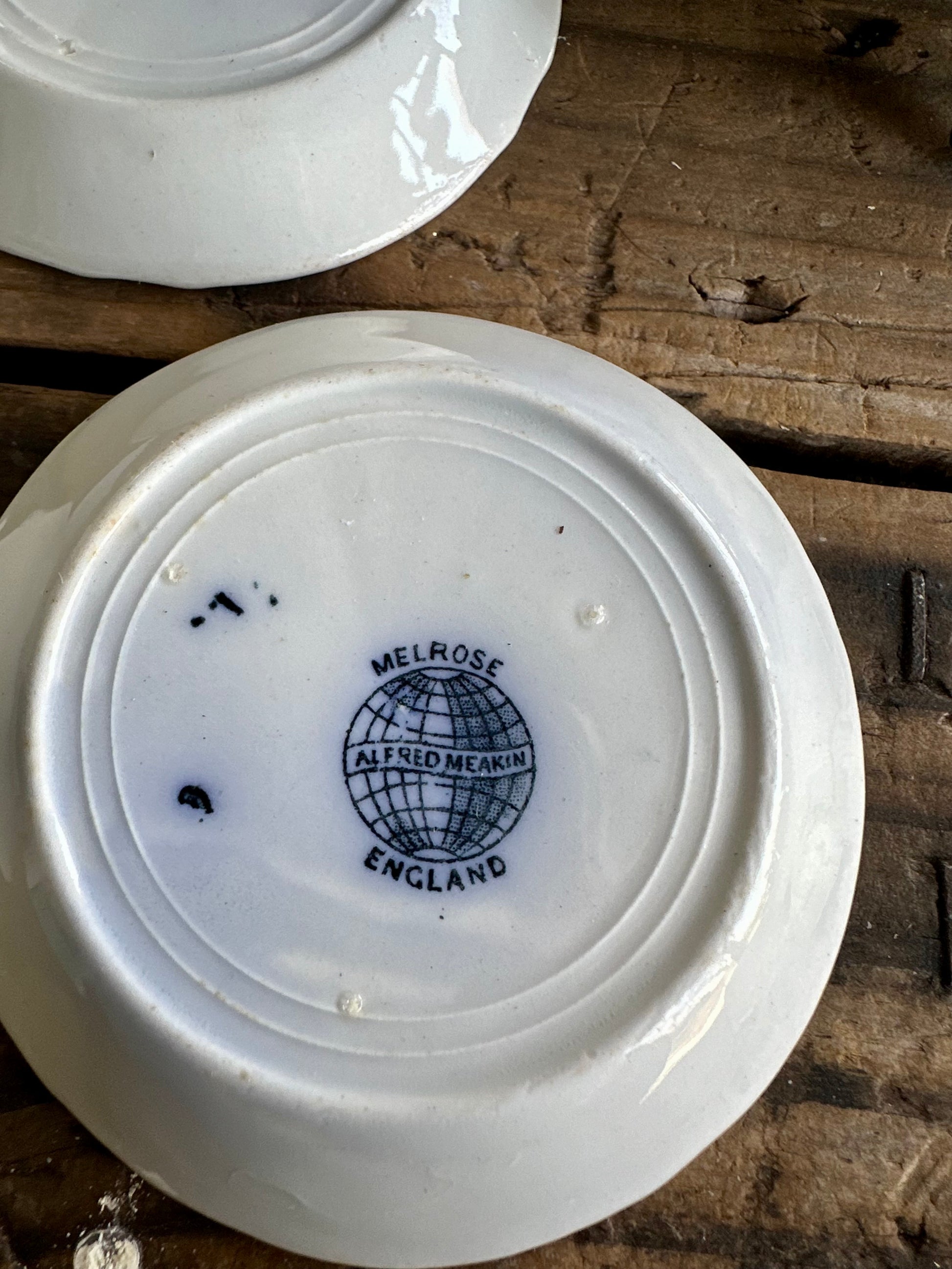 Beautiful blue floral transferware butter pat set of four. Navy blue, gray and shades of blue colors. Bits of staining and pitting. Backs stamped Alfred Meakin Melrose England. Approx 3 1/8" diameter. Worn vintage condition. Two have small chip on edge. Great to add to start a collection, add to a collection, stack, or display with any decor!