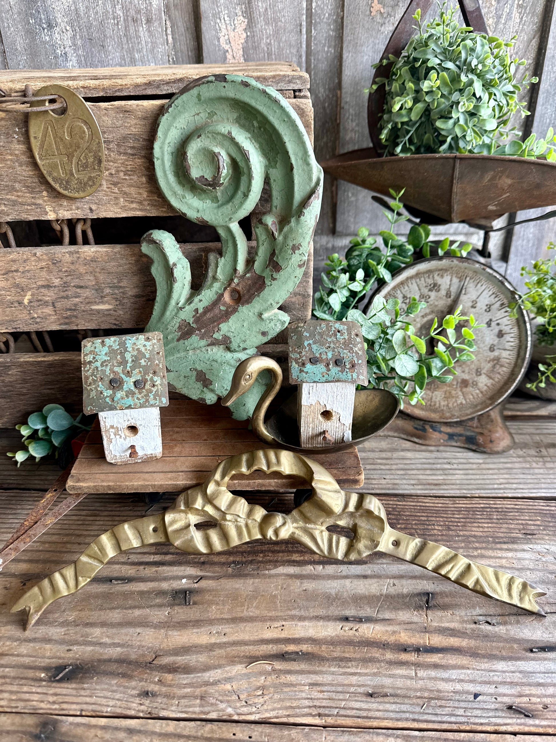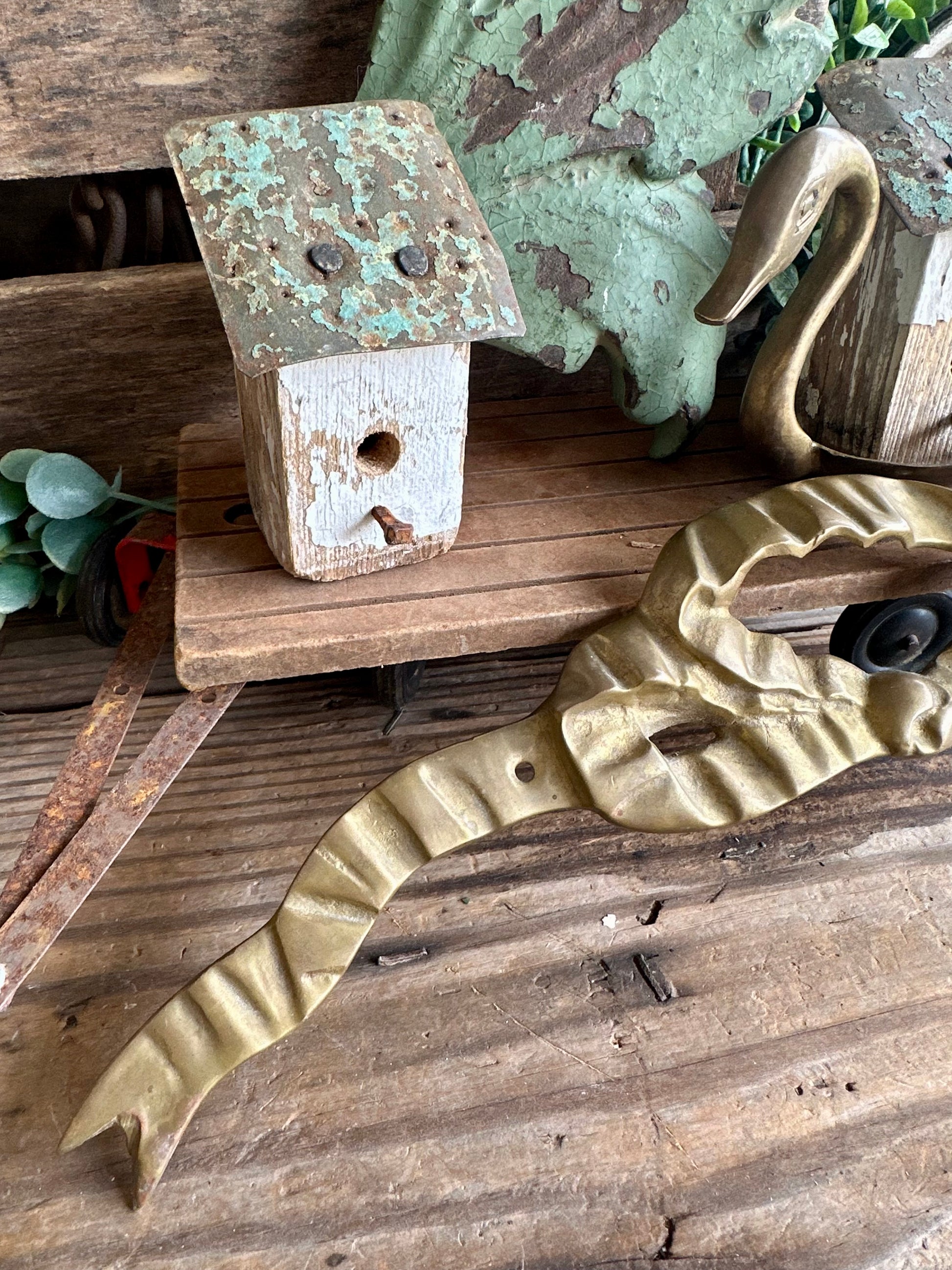 Brass bow with two holes for hanging or attaching to another piece. Sticker on back made in India. Approx 14" long. Weathered, worn and tarnish from use and age. Great addition to attach to another piece, addition to a brass collection or layer in with decor!