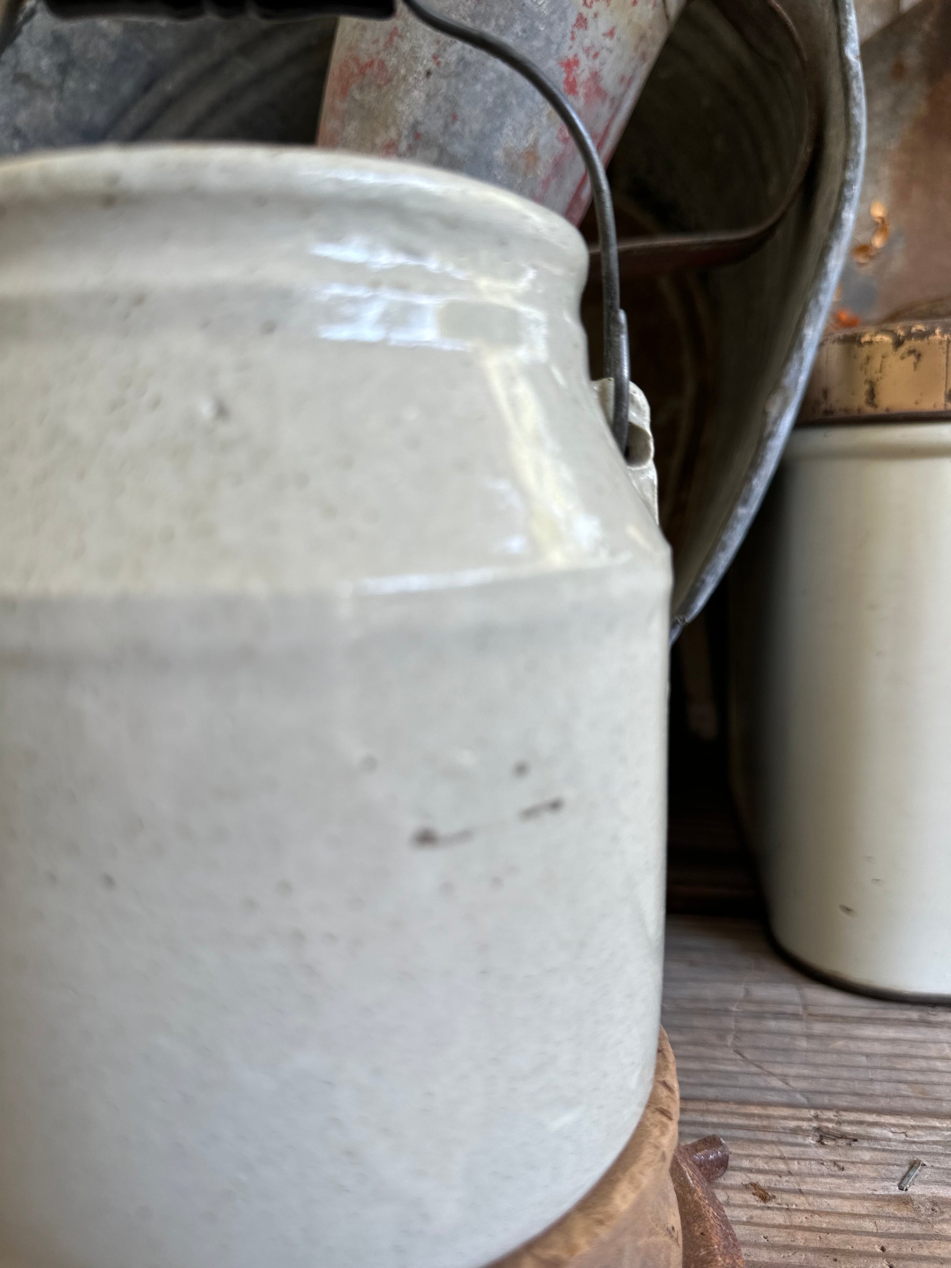 Crock with wire bail and black wood handle. No lid. Approx 5" tall with handle down, 4 5/8" bottom diameter. Weathered and worn condition, see photos. Perfect to add florals to for any season or add to any crock collection!