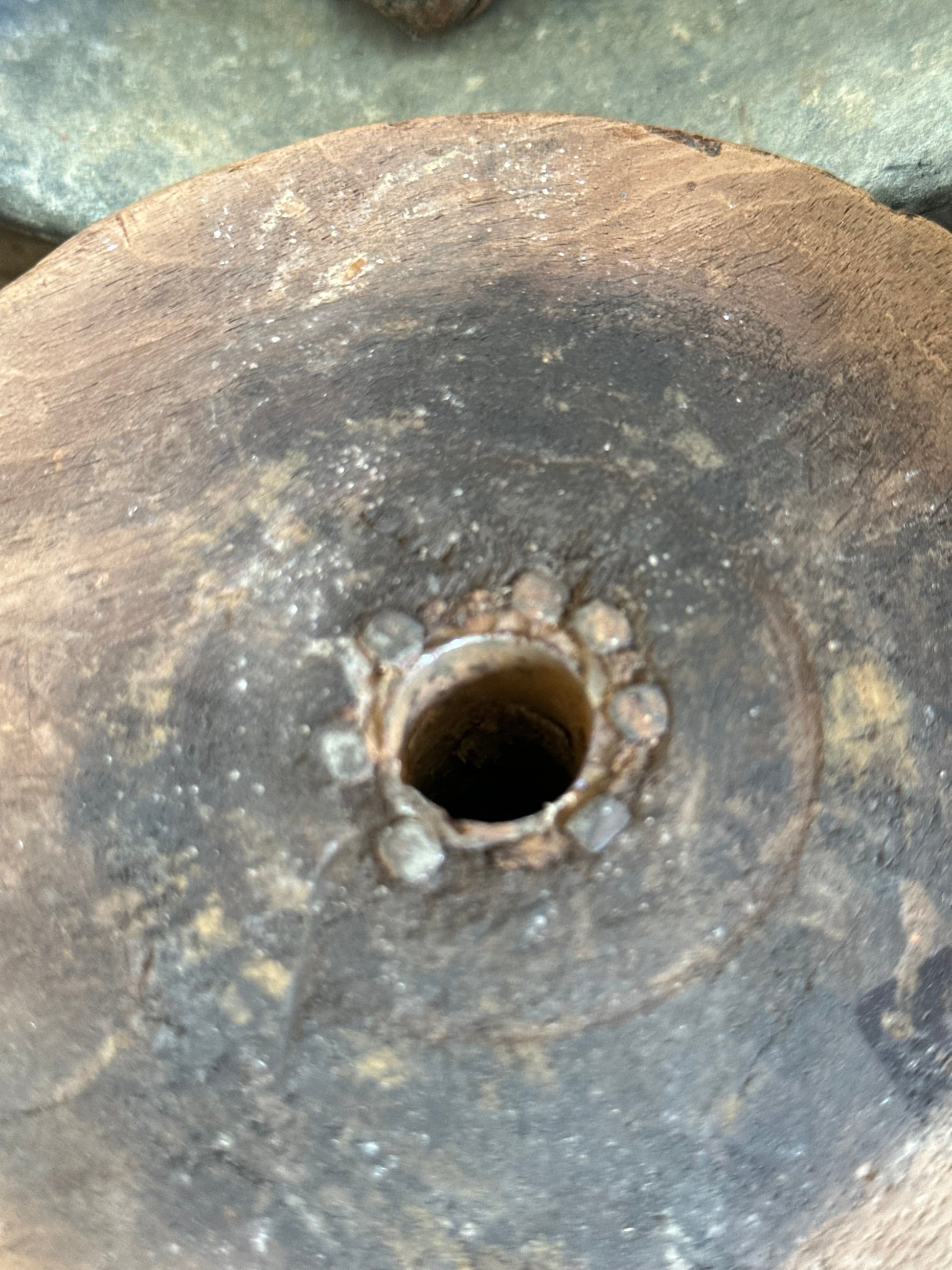 Set of two riser set. Salvage wood pulley sheave and rusty metal sprocket piece. Wood sheave approx 5 1/8" diameter, 1 3/8" tall. Rusty metal sprocket 6 5/8" diameter. Total height stacked approx 2 1/8". Weathered and worn, rusty metal and hardware. See photos. Great to use as a riser for decor!