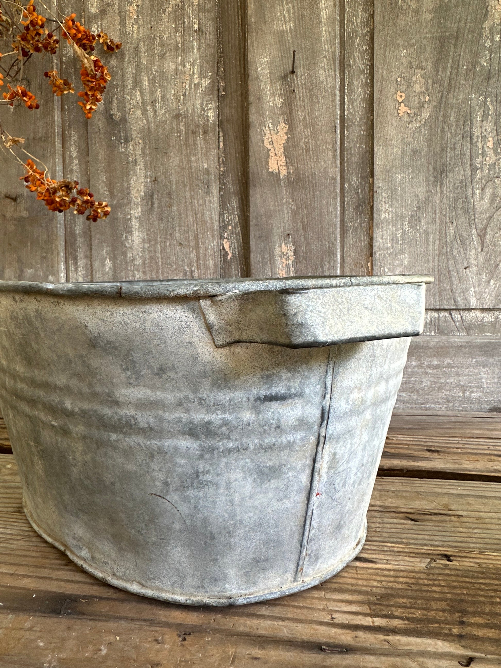 Galvanized oval pan/tub with handle on each end. Approx 17 1/2" wide handle to handle, 6 7/8" tall. See photos for weathered and worn condition. Break in center top and denting. Great for seasonal decor!